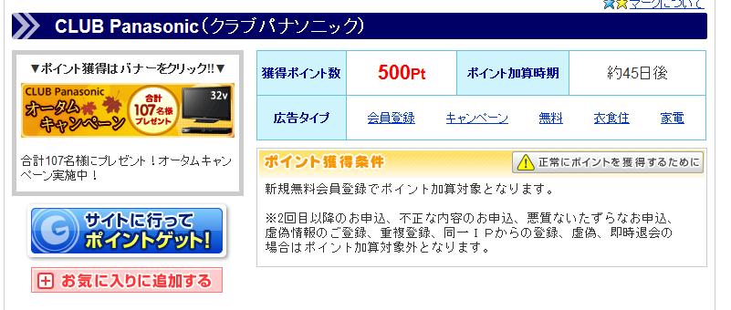Get moneyからCLUB Panasonic(クラブパナソニック)に無料登録して500ポイント!