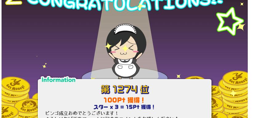 Get moneyのビンゴで久しぶりに当選!最近アイテムも貰いにくくなったし、なかなか当選しなかったんですが、久しぶりに当選した上に自己最高位を更新しました♪そんなに早いとは思っていなかったんですが、どうやらほかのメンバーの人も当選しにくくなっているんでしょうねぇ。