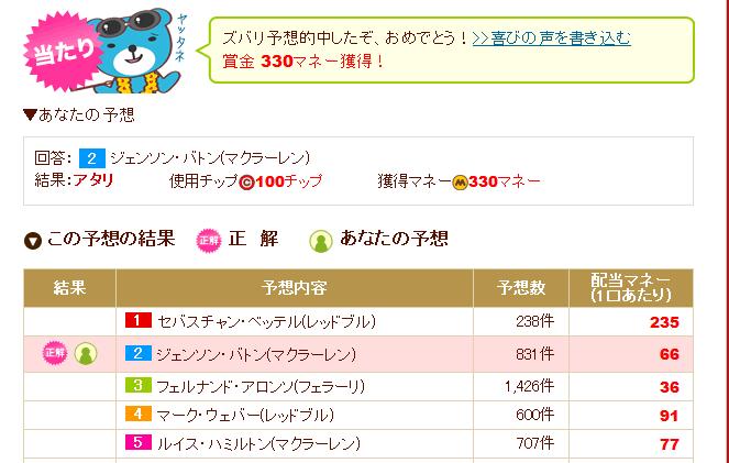 ここぞとばかりにジェンソン・バトンに最大数のチップをかけたら、見事に正解♪