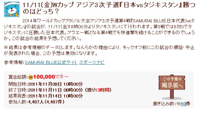 5050.jpの『サッカー日本代表vsタジキスタン戦』の予想に参加してみた