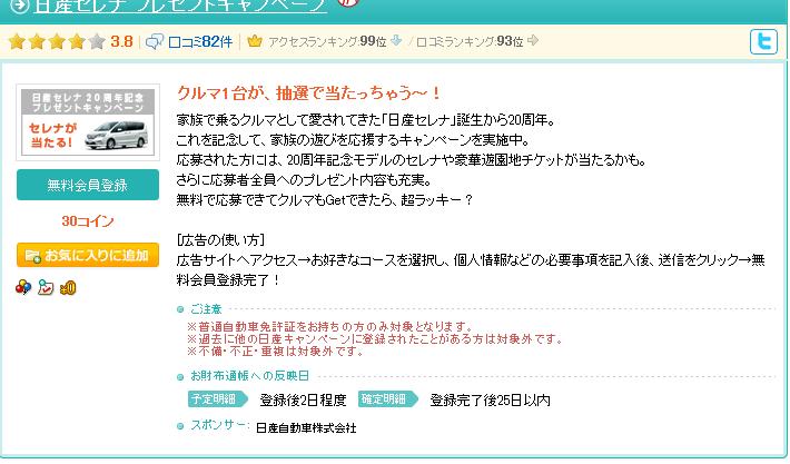 日産でセレナが当たるキャンペーンを実施しています。そして、例によって『Get money』や『お財布.com』経由でキャンペーンに参加すると報酬までもらえちゃいます。